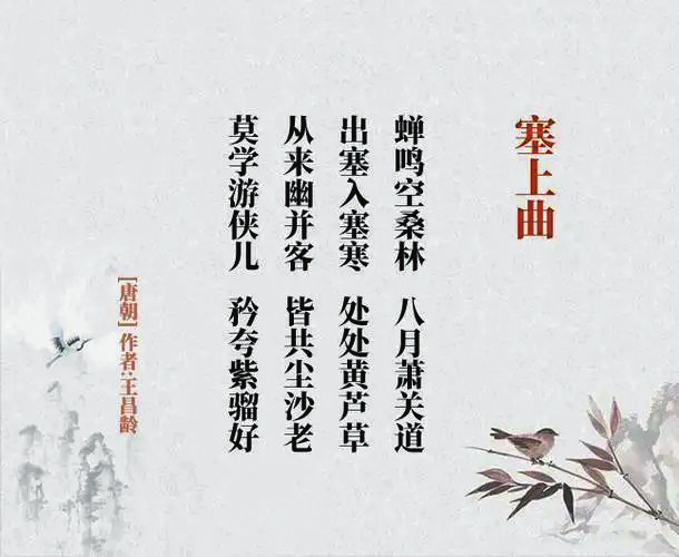 《塞上曲》唐(王昌齡):“蟬鳴空桑林,八月蕭關(guān)道。出塞入塞寒,處處黃蘆草。從來幽并客,皆共塵沙老。莫學游俠兒,矜夸紫騮好。”詩中的塞上、塞下,說穿了就是關(guān)外和關(guān)內(nèi)。但,其實景象沒什么特別,黃云、風沙、駿馬、朔雪、美酒、桑林、關(guān)道、蘆草、沙場,也似乎只有這些才能更符合邊塞詩人的審美。而“雁門關(guān)”成了李頎、王昌齡這對好友的共同命題。