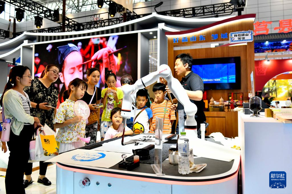 9月16日,在山東國(guó)際會(huì)展中心,來(lái)自濟(jì)寧市的參會(huì)人員在展示機(jī)器人書(shū)寫(xiě)漢字。