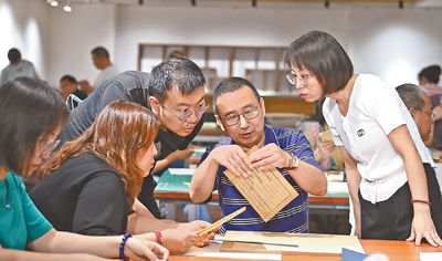 山西省圖書(shū)館,來(lái)自國(guó)家圖書(shū)館的古籍修復(fù)專家劉建明(右二)在給該省第一期古籍修復(fù)培訓(xùn)班的學(xué)員們講解古籍修復(fù)技巧。