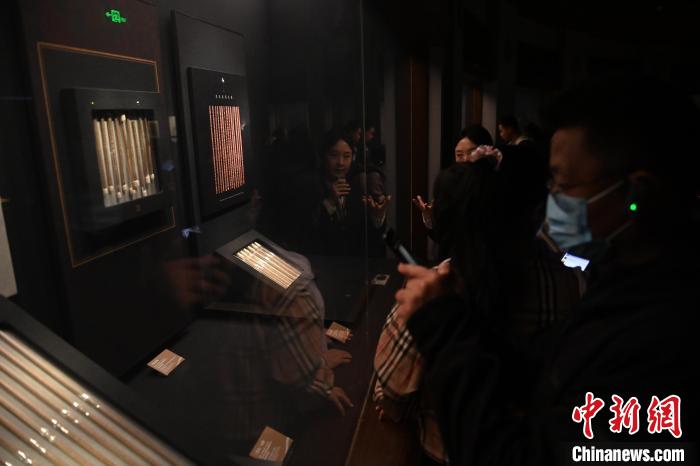 4月16日,甘肅省博物館鎮(zhèn)館之寶漢代《醫(yī)藥木簡》吸引參觀者駐足參觀。李亞龍 攝