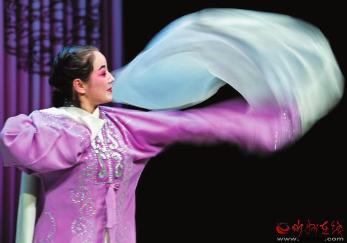 演出中場(chǎng)休息時(shí),演員太雨琴為觀眾示范北路梆子“水袖”技藝。