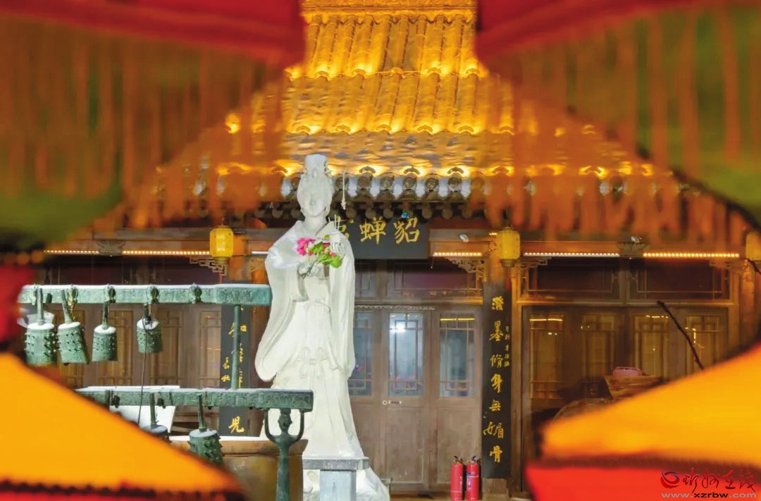 現(xiàn)在的貂蟬陵園是在墓地原址重新筑砌的,坐北朝南,門檐上懸“貂蟬陵園”橫匾,兩側(cè)有“閉月羞花堪為中國驕傲,忍辱步險實(shí)令須眉仰止”的金文楹聯(lián)。園內(nèi)用花墻分隔成南、北兩部分,北為陵區(qū),南為展區(qū)。南院建貂蟬彩塑館,再現(xiàn)“貂蟬迎賓”“羞花問世”“祭山驚艷”“落難認(rèn)父”“拜月銘志”“憂國請纓”“施計(jì)除奸”“繡袍寄情”等場面,反映了貂蟬“不惜萬金軀,何懼險象生”的一生。