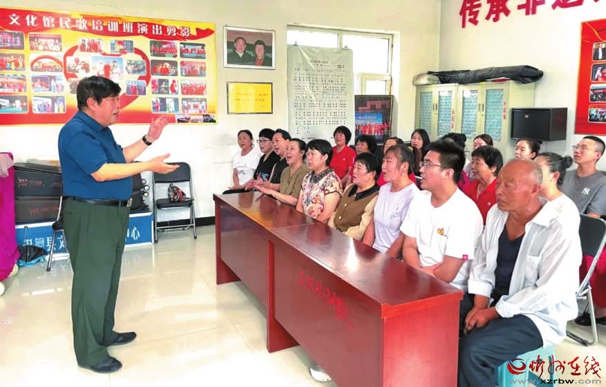 在保德縣文化館,山西省級(jí)非物質(zhì)文化遺產(chǎn)項(xiàng)目(保德民歌)代表性傳承人、“黃河之濱民歌王”楊仲青現(xiàn)場(chǎng)教授學(xué)員保德民歌唱法。 白 灝 攝