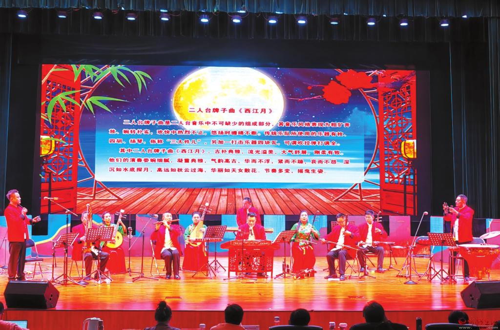 由河曲縣文化和旅游局選送、河曲縣民歌二人臺(tái)藝術(shù)團(tuán)演奏的二人臺(tái)牌子曲《巴音杭蓋》,是一首標(biāo)題性器樂曲。從曲式上看,屬“多基腔板式變化體”,由“慢板”“流水板”“捏字板”3種板式構(gòu)成;從音調(diào)上看,滲入了內(nèi)蒙古民間器樂元素,并使用了“清角為宮”的手法,使其在總的徵調(diào)式基礎(chǔ)上具有了多宮調(diào)、多調(diào)式因素而形成動(dòng)力性和展開性。演奏中,全體演奏員配合默契,充分運(yùn)用即興加花、支聲復(fù)調(diào)的傳統(tǒng)演奏手法,“團(tuán)玩”而熱鬧。