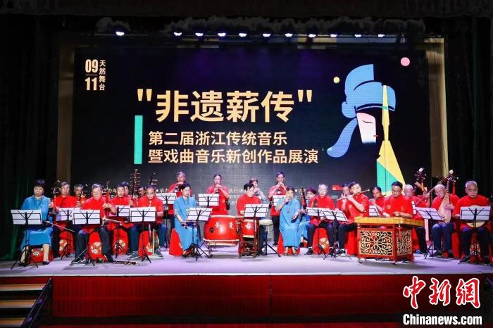 2024“非遺薪傳”第二屆浙江傳統(tǒng)音樂暨戲曲音樂新創(chuàng)作品展演上,石菊林(一排中間)和隊(duì)員們在演出。鐘靚 供圖