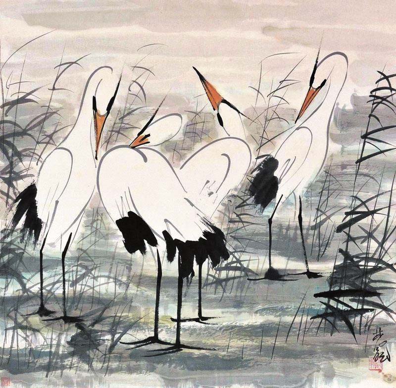 到了近現(xiàn)代,傳統(tǒng)文藝思想開始發(fā)生轉(zhuǎn)變,呂澂、康有為等人在繪畫領(lǐng)域提出改良思想,鶴主題的繪畫也有所變化。在林風(fēng)眠創(chuàng)作的《群鶴圖》《雙鶴圖》《白鶴》等作品中,既可以看到中國(guó)畫白描的影子,又可以感受到西方速寫技法的影響?!度胡Q圖》由幾只立于廣袤水草的白鶴構(gòu)成,它們姿態(tài)各不相同。與鶴之閑適姿態(tài)相對(duì)應(yīng)的是隨風(fēng)浮動(dòng)的蘆葦,它們?cè)谖L(fēng)吹拂下雖形態(tài)萬(wàn)千,但并不雜亂,在總體偏暗的色調(diào)中顯出和諧之味?!峨p鶴圖》表現(xiàn)了鶴的輕盈姿態(tài),兩只鶴步伐保持一致,展示出閑適自得之感。林風(fēng)眠筆下的鶴,顯然沒有古代繪畫中仙風(fēng)道骨、富貴長(zhǎng)壽之意,與寫意之鶴相比,其作品里的鶴與自然萬(wàn)物融為一體,表達(dá)出強(qiáng)有力的現(xiàn)代語(yǔ)言。