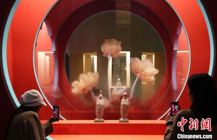 據(jù)介紹,這是蛇類紋飾作為裝飾題材出現(xiàn)在商周青銅禮器之上的一種典型代表。半人半蛇的唐代“伏羲女媧像立幅”帛畫,印證著伏羲女媧這一久遠(yuǎn)的文化信仰,通過絹帛畫形式在當(dāng)時(shí)的吐魯番地區(qū)傳播,并吸引其他民族的崇奉。此外,展廳中充滿新春氛圍感的桃花洞釉燈籠瓶、白玉“天官賜福”佩、“好酒”白釉盤等近200余件(套)館藏文物精品,書寫著對(duì)即將到來的蛇年新春的期待和祝福。