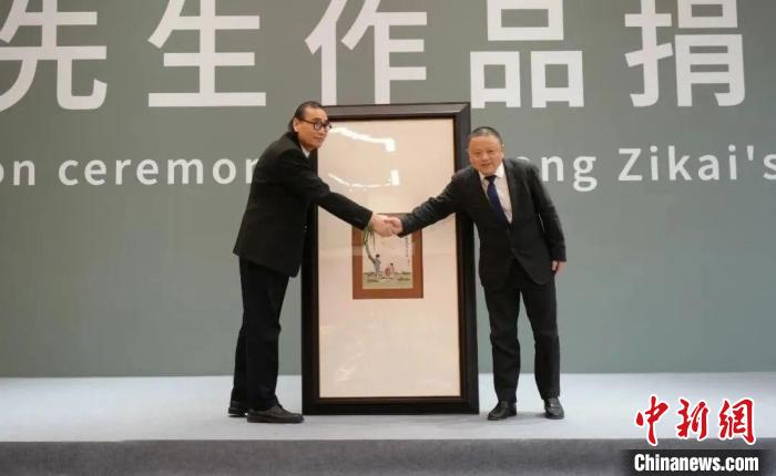 中國(guó)國(guó)家畫院院長(zhǎng)劉萬(wàn)鳴(左)接受豐子愷家屬捐贈(zèng)的豐子愷國(guó)畫作品。 中國(guó)國(guó)家畫院供圖