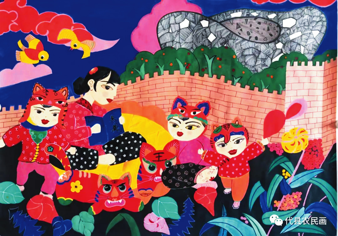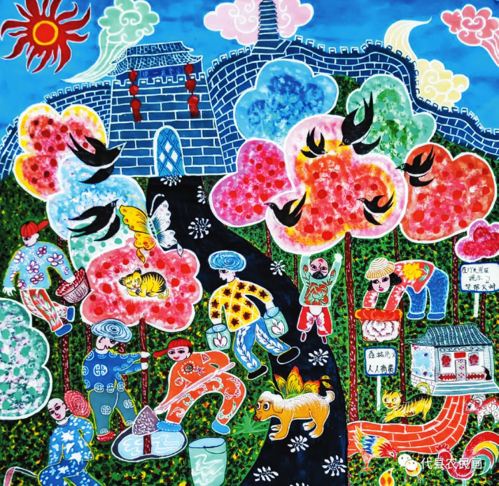 中國歷史文化名城代縣,文化底蘊深厚,民俗傳統(tǒng)技藝精巧別致,1988年和2008年先后被文化部授予“中國民間繪畫畫鄉(xiāng)”“中國民間文化藝術(shù)之鄉(xiāng)”。該縣的農(nóng)民畫早在上世紀(jì)80年代初就在全國產(chǎn)生過較大影響,之后經(jīng)歷了一段低迷期。近年來在代縣農(nóng)民畫促進(jìn)會的推動之下,農(nóng)民畫又重新煥發(fā)出耀眼的光彩。先后涌現(xiàn)出多位畫家,其中尤以丁全愛、戴翠平、祁磊、賈永花、郎冬梅等18位女畫家組陣的雁門巾幗,在多年鉆研繪畫技巧的基礎(chǔ)上,創(chuàng)作出一幅幅特色鮮明、獨具匠心的畫作,成為閃耀三晉大地的矩陣,為傳承、弘揚雁門文化做出了新貢獻(xiàn)。