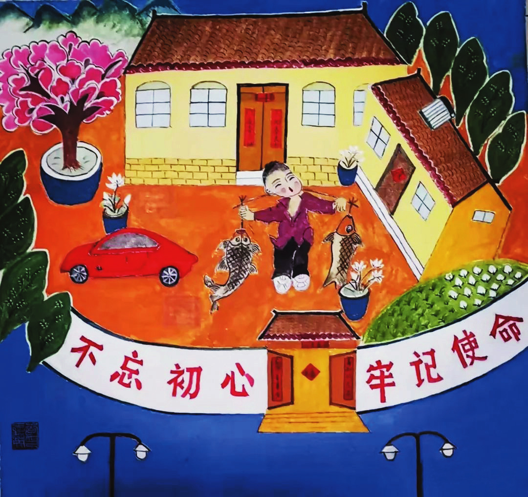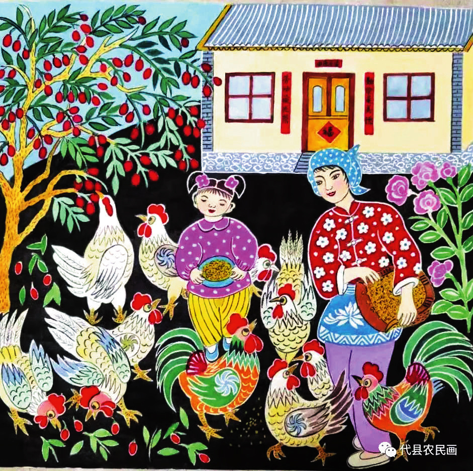 她們的作品,取材于農(nóng)村、農(nóng)業(yè)、農(nóng)民生活,或表現(xiàn)美好的生活場景,或反映豐收的喜悅,或體現(xiàn)鄉(xiāng)愁,在表現(xiàn)手法上采用大膽的夸張、變形,巧用艷麗的色彩,人物刻畫細(xì)致入微,內(nèi)心喜悅躍然紙上,富有鮮明的地方特色。綜觀她們的作品,無不展現(xiàn)了社會主義新農(nóng)村在新時代的新變化、新風(fēng)貌,在傳承和弘揚代縣文化、引領(lǐng)社會主義精神文明建設(shè)方面做出了出色的嘗試與實踐。