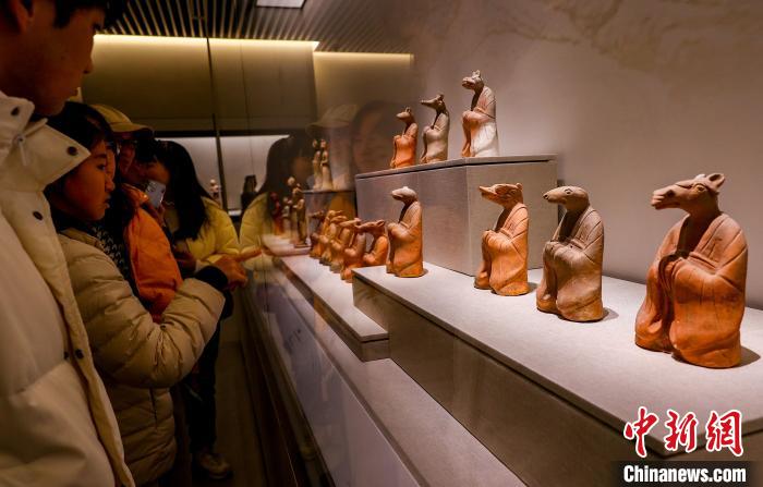 1月28日,游客在湖北省博物館觀賞十二生肖蛇俑。中新社記者 張暢 攝
