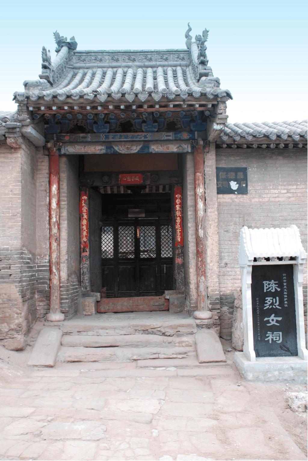 陳烈女祠坐西向東,為二進(jìn)院落布局。占地面積685平方米。大門一座,前院過殿面寬三間,單檐硬山頂;南北配殿各面寬三間,單檐硬山頂。后院正殿面寬三間,單檐硬山頂,前設(shè)小抱廈;后院正殿內(nèi)供奉陳烈女塑像。祠內(nèi)存有明崇禎七年(1634)“圣旨(復(fù)制品)”一道,新繪壁畫16平方米。2007年6月,陳烈女祠被忻州市人民政府公布為市級(jí)文物保護(hù)單位。