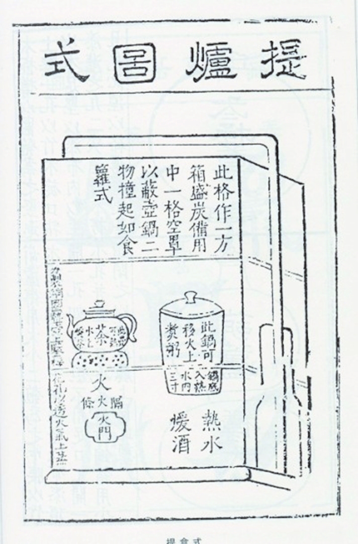 明代戲曲家高濂編撰的《遵生八箋》,可謂士大夫精致生活的指導(dǎo)書,書中仔細(xì)介紹了提爐的形制與結(jié)構(gòu),還附上了插圖。書云:“式如提盒,亦余制也。高一尺八寸,闊一尺,長一尺二寸,作三撞。下層一格,如方匣,內(nèi)用銅造水火爐,身如匣方,坐嵌匣內(nèi)。中分二孔,左孔炷火,置茶壺以供茶;右孔注湯,置一桶子小鑊有蓋,頓湯中煮酒。長日午余,此鑊可煮粥供客。傍鑿一小孔,出灰進風(fēng)。其壺鑊迥出爐格上,太露不雅,外作如下格方匣一格,但不用底以罩之,便壺鑊不外見也。一虛一實共二格,上加一格,置底蓋以裝炭,總?cè)癯梢患?,上可箾關(guān),與提盒作一副也?!?/p>