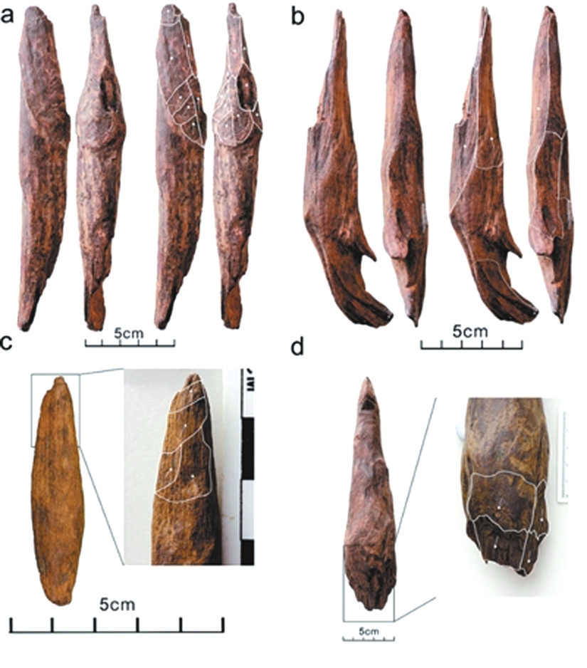 在沒有鎬、鏟等金屬工具的情況下,生活在甘棠箐遺址的古人群是如何將深埋于地下的可食性植物根塊挖掘出來并加以食用的?遺址出土的木質(zhì)材料給我們提供了答案:古人類制作和使用了木器。在該遺址發(fā)掘出土的近千件木質(zhì)材料中,35件被鑒定為人類加工的木器。這些木器主要用松樹制作,器身挺直光滑,一端或兩端被加工成尖狀,尖部形態(tài)包括鑿型、鏟型、錐型等。其中兩件是需雙手持握的大型挖掘棒,還有4件具有獨(dú)特的鉤狀尖刃,可用于切斷植物根系,其余則為可單手持握的小型挖掘工具。