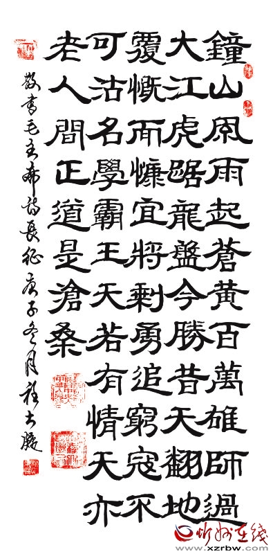 二是程老有真功。他一人能熟練書寫甲骨、篆書、魏碑、曹全隸、乙瑛隸、章草、歐柳楷、顏趙楷、行楷、行書、行草、草書、伊秉綬隸、創(chuàng)新粗圓、創(chuàng)新仿宋、創(chuàng)新大黑、創(chuàng)新角篆、仿毛體18種書體(見(jiàn)圖)。還會(huì)畫畫寫詩(shī),詩(shī)書畫樣樣精通。對(duì)程大凝而言,臨帖是他最大的快樂(lè),創(chuàng)作是他最大的滿足?,F(xiàn)在他的工作室有4000多幅作品。退休后參加全國(guó)性書法大賽就獲獎(jiǎng)300余次。