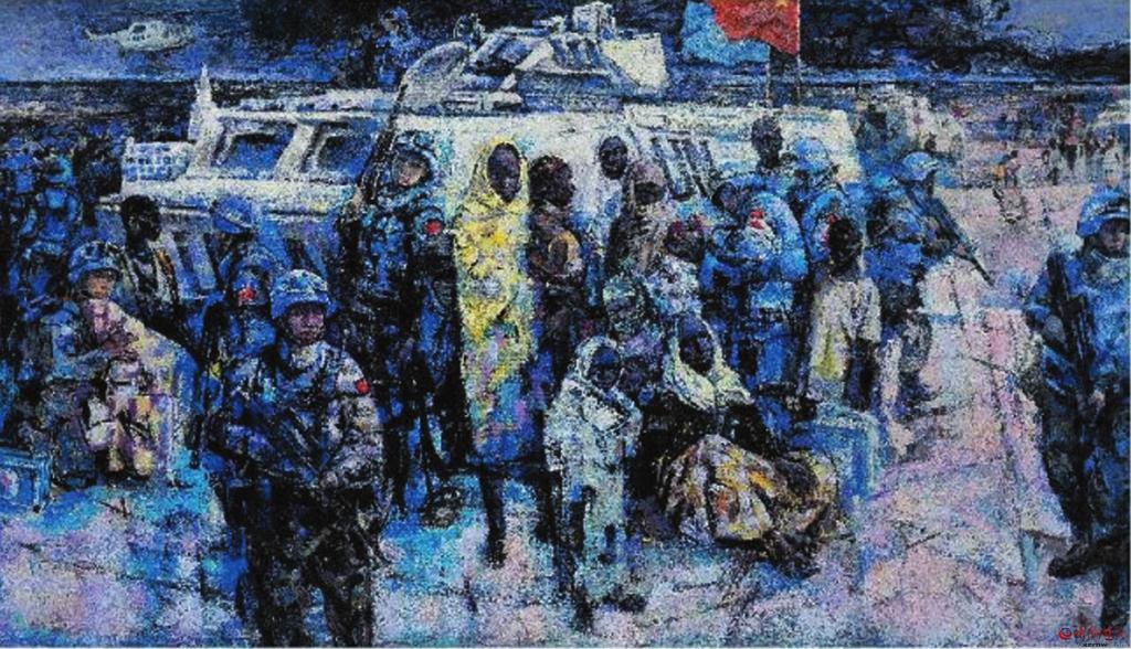 在續(xù)鶴賢眾多的作品中,從畫面表現(xiàn)效果方面,我是比較喜歡《和平使命——藍(lán)色交響曲》這幅作品的。無論畫面構(gòu)圖、色彩關(guān)系,還是人物造型以及表現(xiàn)技巧,都堪稱完美。畫面中無論人物形象、動態(tài)、表情,還是人與自然背景,都處在一種和諧美好的關(guān)系中,從一個新的角度給予美好詮釋。這幅作品表現(xiàn)的是我們的維和部隊“子弟兵”以自己的生命守護(hù)著世界和平,講述著構(gòu)建人類命運(yùn)共同體的大國情懷。 (邢晨聲 文)