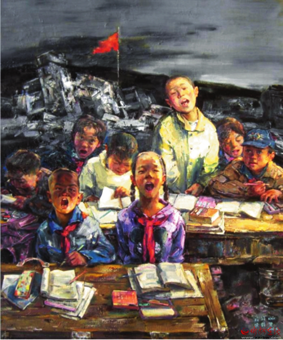 同樣表現(xiàn)地震題材的另一幅作品《震后復(fù)課》則展示出另外一種浪漫情懷,發(fā)人深省,令人感慨萬(wàn)千。在尚未處理完畢的地震廢墟上,孩子們真誠(chéng)地開(kāi)始了希望的追求,展示著大震壓不垮的人性力量和災(zāi)后最具震撼力的希望。是的,紅旗在哪里,精神支撐就在哪里。孩子是希望,是未來(lái)。在孩子們的臉上,沒(méi)有恐懼和悲哀,沒(méi)有茫然與無(wú)助,有的只是對(duì)知識(shí)的渴望,對(duì)未來(lái)的憧憬。一個(gè)角落的復(fù)課場(chǎng)景,映射著中華民族偉大復(fù)興的精神力量。 邢晨聲 文