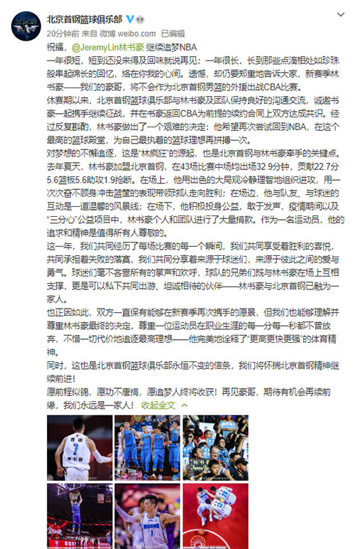 人民網(wǎng)北京9月15日電(楊喬棟)15日,林書豪通過個(gè)人社交平臺發(fā)布自制視頻宣布,下個(gè)賽季將不再代表北京首鋼男籃征戰(zhàn)CBA賽場,而將繼續(xù)尋求征戰(zhàn)美國職業(yè)籃球聯(lián)賽的機(jī)會。林書豪在視頻中稱,最近四周都在思考下一步的規(guī)劃,但是最終還是忍痛做了一個(gè)艱難的決定——暫時(shí)告別CBA,“我決定今年(下個(gè)賽季)不回首鋼去打球,這個(gè)決定是我人生最難的一個(gè)決定?!彪S后,北京首鋼男籃通過官方微博發(fā)布長文,在確認(rèn)林書豪“離開”的同時(shí)也第一時(shí)間為其送上祝福。北京男籃官宣全文如下: