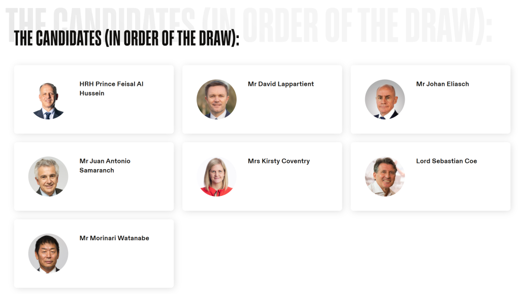 在國(guó)際奧委會(huì)近131年的歷史上,一共產(chǎn)生過(guò)九位主席,其中八人來(lái)自歐洲,另外一位來(lái)自美國(guó)。根據(jù)《奧林匹克憲章》,主席候選人必須是現(xiàn)任國(guó)際奧委會(huì)委員。本次參與競(jìng)選的共有七人,其中歐洲四人,分別是國(guó)際奧委會(huì)副主席小薩馬蘭奇(65歲,西班牙)、世界田聯(lián)主席塞巴斯蒂安·科(68歲,英國(guó))、國(guó)際自行車聯(lián)盟主席大衛(wèi)·拉帕爾蒂安(51歲,法國(guó))和國(guó)際雪聯(lián)主席約翰·埃利亞施(63歲,瑞典和英國(guó)雙重國(guó)籍);亞洲兩人,分別是國(guó)際奧委會(huì)執(zhí)委費(fèi)薩爾·侯賽因(61歲,約旦)和國(guó)際體操聯(lián)合會(huì)主席渡邊守成(66歲,日本);非洲一人,國(guó)際奧委會(huì)執(zhí)委、運(yùn)動(dòng)員委員會(huì)前主席柯絲蒂·考文垂(41歲,津巴布韋)。
