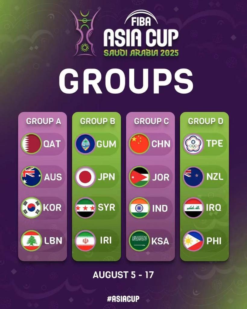 新華社北京4月8日電 2025國(guó)際籃聯(lián)(FIBA)亞洲杯抽簽儀式8日在沙特阿拉伯吉達(dá)舉行,中國(guó)男籃與約旦隊(duì)、印度隊(duì)和東道主沙特阿拉伯隊(duì)被分入C組。 具體分組如下: A組:卡塔爾隊(duì)、澳大利亞隊(duì)、韓國(guó)隊(duì)、黎巴嫩隊(duì); B組:關(guān)島隊(duì)、日本隊(duì)、敘利亞隊(duì)、伊朗隊(duì); C組:中國(guó)隊(duì)、約旦隊(duì)、印度隊(duì)、沙特阿拉伯隊(duì); D組:中國(guó)臺(tái)北隊(duì)、新西蘭隊(duì)、伊拉克隊(duì)、菲律賓隊(duì)。