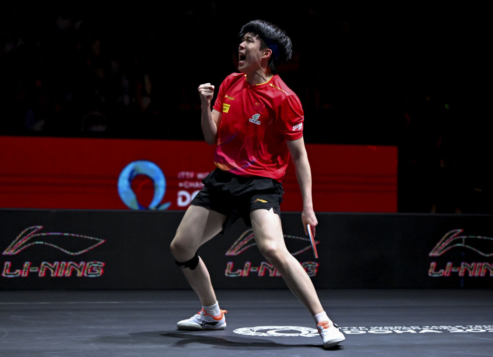 5月22日,王楚欽在比賽中慶祝得分。新華社記者 賀長(zhǎng)山 攝