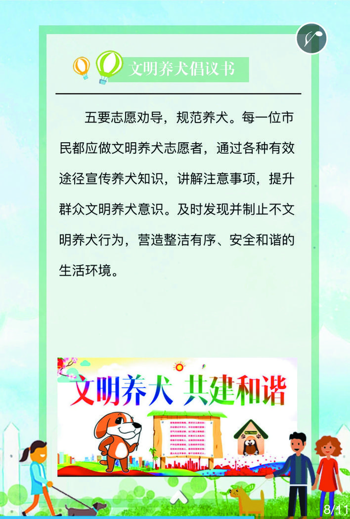 《文明養(yǎng)犬公告》包含十一項主要內(nèi)容,具體是:一、養(yǎng)犬人應(yīng)當(dāng)遵守有關(guān)法律、法規(guī),尊重社會公德,維護公共秩序,不得損害社會公共利益和他人的合法權(quán)益;二、養(yǎng)犬管理按照重點管理區(qū)和一般管理區(qū)實行分區(qū)管理。忻府轄區(qū)外環(huán)線范圍以內(nèi)為養(yǎng)犬重點管理區(qū)。其他區(qū)域為養(yǎng)犬一般管理區(qū);三、養(yǎng)犬實行狂犬病免疫制度。犬只出生滿三個月或者免疫期滿的,養(yǎng)犬人應(yīng)當(dāng)攜犬只到獸醫(yī)主管部門公布的犬只免疫網(wǎng)點接種狂犬疫苗;四、在重點管理區(qū)內(nèi)養(yǎng)犬實行責(zé)任書制度。村(居)民委員會或者社區(qū)物業(yè)管理機構(gòu)應(yīng)當(dāng)與養(yǎng)犬人簽訂養(yǎng)犬責(zé)任書,明確有關(guān)文明養(yǎng)犬的責(zé)任事項;五、在重點管理區(qū)內(nèi)養(yǎng)犬實行登記制度。養(yǎng)犬人應(yīng)當(dāng)自取得免疫證明之日起三十日內(nèi),到居住地公安派出所辦理養(yǎng)犬登記;六、在重點管理區(qū)內(nèi),禁止飼養(yǎng)、繁殖和經(jīng)營禁養(yǎng)名錄內(nèi)的烈性犬和大型犬(導(dǎo)盲犬除外);禁止開辦犬類養(yǎng)殖場;七、在重點管理區(qū)內(nèi)攜帶犬只出戶,應(yīng)當(dāng)遵守下列規(guī)定:(一)為犬只佩帶犬牌、束牽引帶,牽引帶長度不得超過兩米,在擁擠場合自覺收短牽引帶。(二)具有完全民事行為能力的人牽引。(三)主動避讓老年人、殘疾人、孕婦和兒童。(四)乘坐電梯,應(yīng)當(dāng)避開高峰期,征得電梯內(nèi)其他人的同意,佩戴嘴套或裝入犬籠、犬袋,并主動避讓他人。(五)及時清除犬只排泄的糞便。(六)不得攜犬進入設(shè)有犬類禁入標志的公園、廣場等公共場所。(七)不得攜犬乘坐大型公共交通工具,攜犬乘坐出租汽車時,須征得司機同意。(八)養(yǎng)犬不得干擾他人正常生活,不得放任、驅(qū)使犬只恐嚇、攻擊他人,影響他人休息的,養(yǎng)犬人應(yīng)當(dāng)采取措施予以制止;八、凡流浪犬或無人牽領(lǐng)的犬只,視為無主犬只予以收容;九、市民養(yǎng)犬應(yīng)當(dāng)按規(guī)定對所養(yǎng)犬只注射狂犬疫苗、定期檢疫。犬只出現(xiàn)狂犬癥狀的,養(yǎng)犬人應(yīng)當(dāng)及時采取捕滅措施,并向農(nóng)業(yè)部門報告,危害公共安全的,應(yīng)及時報告公安部門;十、違反有關(guān)規(guī)定將依據(jù)《忻州市養(yǎng)犬管理條例》、《中華人民共和國治安管理處罰法》等法律進行處罰;十一、廣大市民應(yīng)積極抵制不文明養(yǎng)犬行為。對違反本通告規(guī)定的養(yǎng)犬行為,任何單位和個人都有權(quán)批評、勸阻,或者舉報。