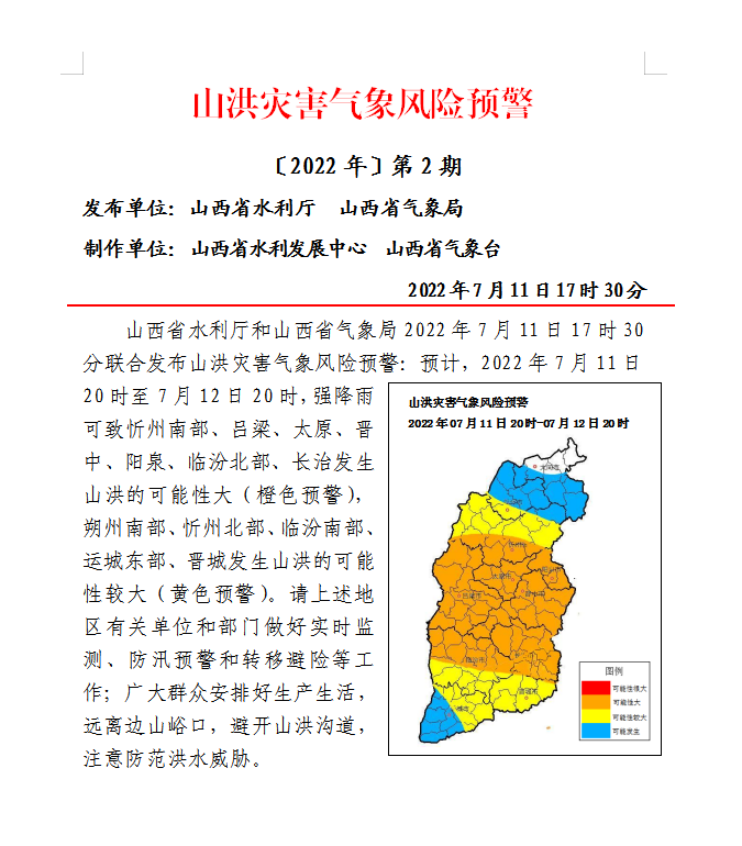 山西省水利廳和山西省氣象局2022年7月11日17時30分聯(lián)合發(fā)布山洪災(zāi)害氣象風(fēng)險預(yù)警:預(yù)計,2022年7月11日20時至7月12日20時,強(qiáng)降雨可致忻州南部、呂梁、太原、晉中、陽泉、臨汾北部、長治發(fā)生山洪的可能性大(橙色預(yù)警),朔州南部、忻州北部、臨汾南部、運(yùn)城東部、晉城發(fā)生山洪的可能性較大(黃色預(yù)警)。