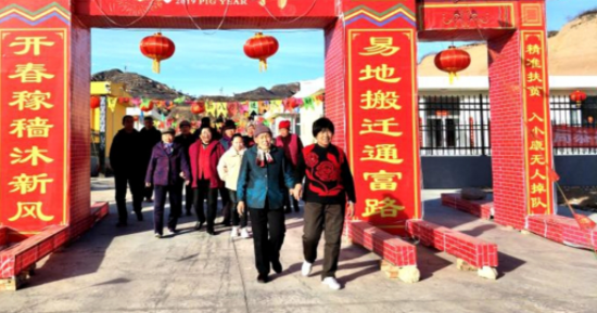 大峪坪易地搬遷點(diǎn)是晉中市太谷區(qū)完成整村搬遷入住的第一村,春節(jié)前夕,村兩委班子張羅著將小區(qū)布置一新,大門口制作了喜慶醒目的迎春牌樓,牌樓兩側(cè)寫有群眾自編的新春聯(lián),上聯(lián)是:開(kāi)春稼穡沐新風(fēng),下聯(lián)是:易地搬遷通富路。東側(cè)的門柱上寫著:精準(zhǔn)扶貧,入小康無(wú)人掉隊(duì)。