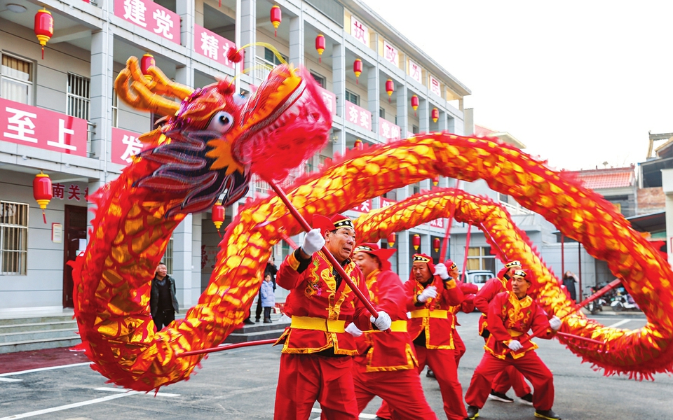 2月9日,在夏縣瑤峰鎮(zhèn)南關(guān)村黨群服務(wù)中心,村民在進行《二龍戲珠》民間社火表演,喜迎新春佳節(jié)。張秀峰 裴國峰攝