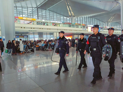在太原南站,隨處可見民警堅守一線守護(hù)平安的身影。本報記者郭寧攝