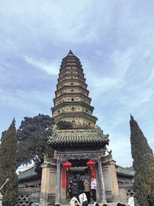 廣勝寺景區(qū)分為上寺、下寺和水神廟三處建筑。飛虹塔、《趙城金藏》、水神廟元代壁畫,并稱為“廣勝三絕”。站在飛虹塔下仰望,美輪美奐的塔身不禁令人稱奇,塔身47.31米高、共13層,底座為八角形,坐落在山上的飛虹塔散發(fā)著威嚴(yán)肅穆的氣息。塔前聚集著眾多游客,有人在靜靜欣賞建筑,有人在默默禱告祈福。新春登高,在塔前祈愿新的一年所愿皆所得,所行皆坦途。