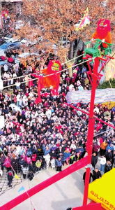 春節(jié)期間,永濟(jì)市虞鄉(xiāng)鎮(zhèn)土樂村村民自發(fā)組織的民間藝術(shù)團(tuán),向省內(nèi)外游客表演省級非遺項(xiàng)目——永濟(jì)空中飛獅。