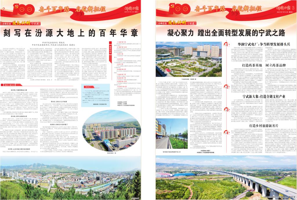 在百年奮斗的征程中,寧武人民丹心向陽(yáng),與時(shí)俱進(jìn),戰(zhàn)勝了一個(gè)又一個(gè)艱難險(xiǎn)阻,取得了令人矚目的成就。特別是黨的十八大以來(lái),全縣上下堅(jiān)持以習(xí)近平新時(shí)代中國(guó)特色社會(huì)主義思想為指導(dǎo),深入貫徹習(xí)近平總書記視察山西重要講話重要指示和“三篇光輝文獻(xiàn)”精神,按照省委“四為四高兩同步”總體思路和要求,圍繞市委“336”戰(zhàn)略布局,寧武人民闊步邁入全面小康,正奮力蹚出一條轉(zhuǎn)型發(fā)展的新路來(lái)。
