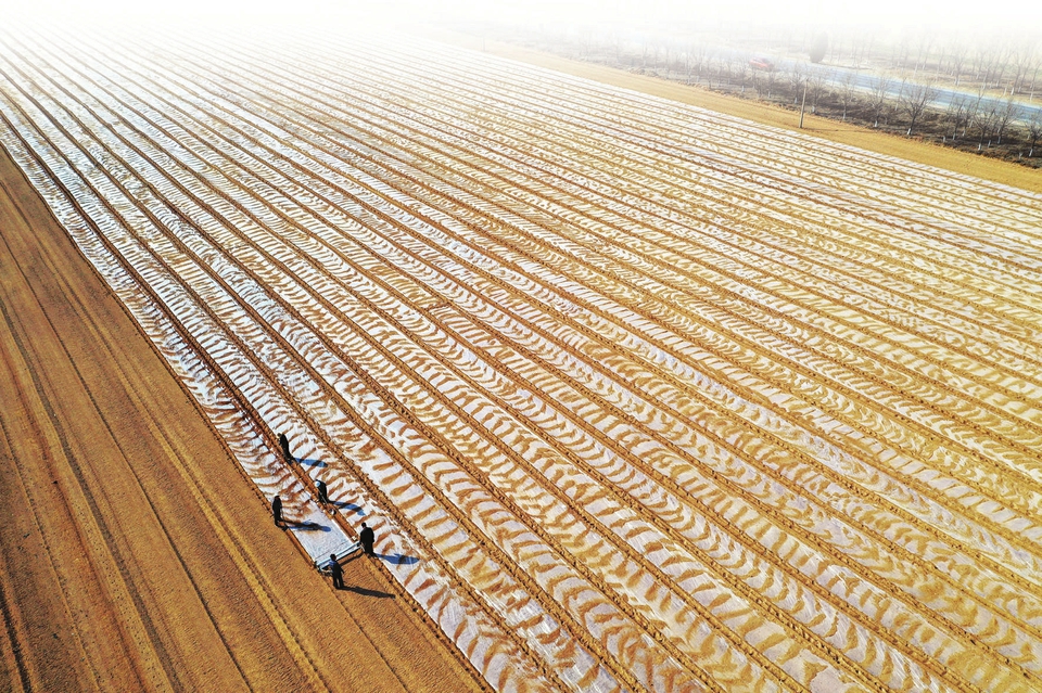 3月24日,在運(yùn)城市北部峨嵋?guī)X上聞喜縣畖底鎮(zhèn)西畖底村,村民抓緊為中藥材防風(fēng)覆蓋地膜保墑保苗(無人機(jī)照片)。連日來,運(yùn)城市農(nóng)民搶抓農(nóng)時科學(xué)種植中藥材,為新種植的防風(fēng)等中藥材精心覆蓋地膜,節(jié)能保墑保苗保質(zhì)量,助力增產(chǎn)增收。從空中俯瞰,田間覆蓋的地膜與農(nóng)民勞作的身影相映成趣,宛如一幅精美的現(xiàn)代農(nóng)耕畫卷。高新生攝