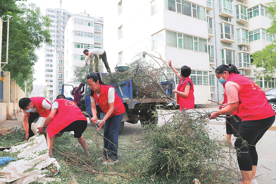 志愿者正在清理小區(qū)內(nèi)垃圾。 本報(bào)記者馮毅松攝