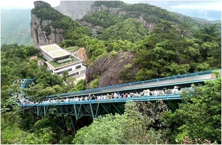 5月27日,在浙江省仙居縣神仙居景區(qū),游客絡(luò)繹不絕,排隊(duì)搭乘纜車和自動(dòng)扶梯上山觀景。