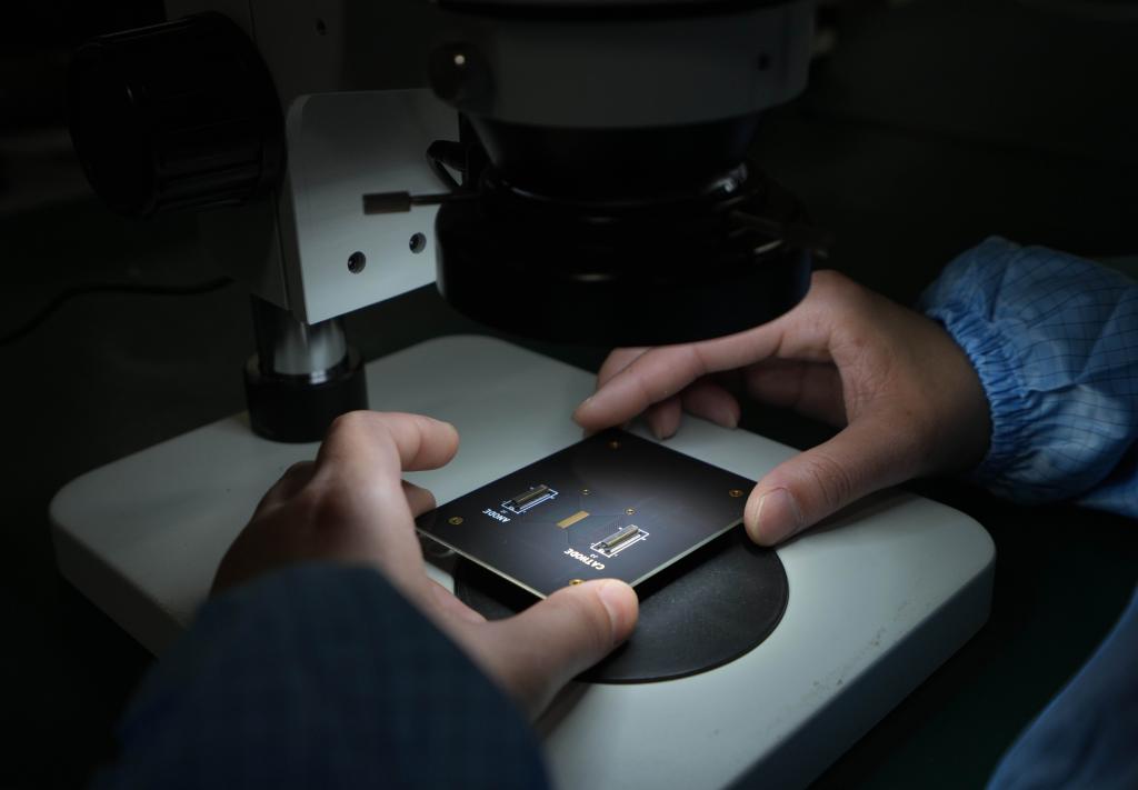 6月2日,工作人員在蘇州光電技術(shù)研究院的封裝測試公共服務(wù)平臺車間內(nèi)檢測一塊激光雷達(dá)芯片。新華社記者 李尕 攝