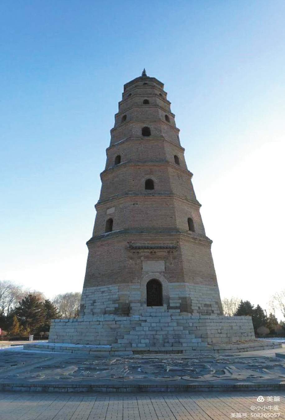 偏關(guān)縣城東山上的文筆塔,又稱“文筆凌霄塔”,是一座保存完好的空心磚塔。始建于明朝天啟元年(1621),原為一座七層磚石結(jié)構(gòu)八角雁塔。崇禎八年(1635)加高四層,共十一層,上書(shū)“文筆凌霄”字樣。塔高35米,塔底周長(zhǎng)29米。清代咸豐七年(1857)文筆凌霄塔因風(fēng)雨侵蝕嚴(yán)重。新中國(guó)建立以后,偏關(guān)人民又重修寶塔。