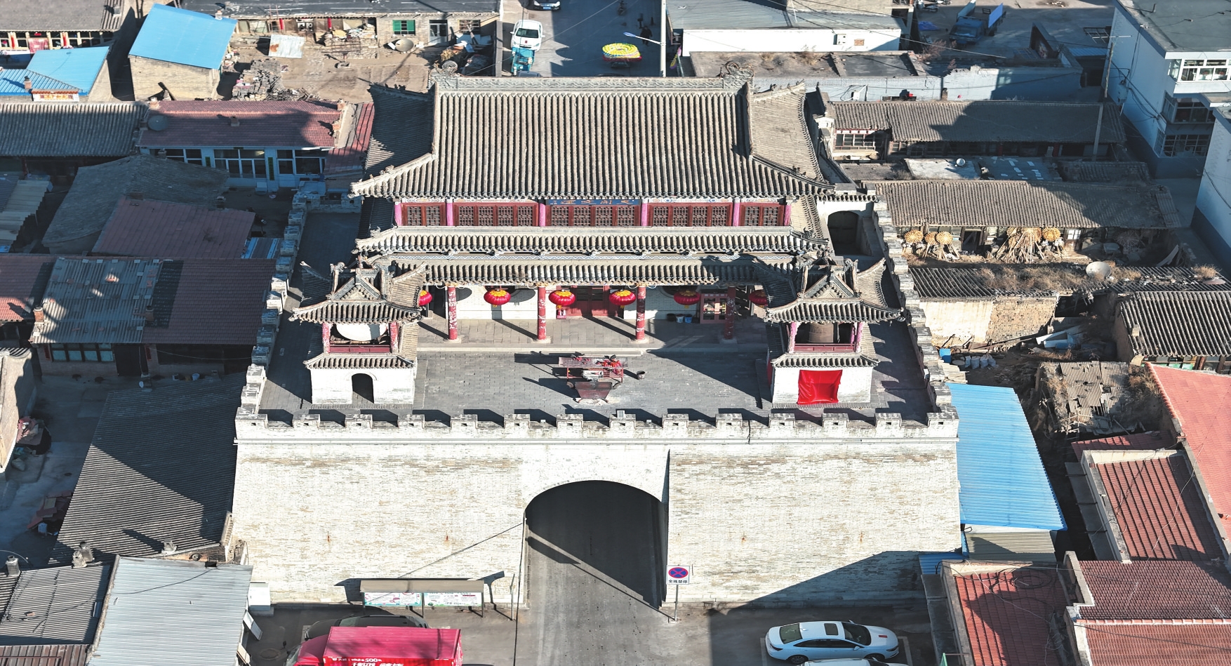 據(jù)重修鼓樓碑和《道光、光緒繁峙縣志》記載,該鼓樓始建于明代萬歷十四年(1586),清康熙二十七年(1688)維修,清乾隆二十三年(1758)增設(shè)鐘樓、鼓樓,光緒二年(1878)重修,現(xiàn)存建筑為明、清建筑。城臺呈方形,條石筑基,青磚鋪面,內(nèi)為夯土。臺基中設(shè)拱券門洞,南北貫通。城樓內(nèi)供奉文昌神,又稱為文昌閣,面寬五間,進(jìn)深四椽,七檁前后廊構(gòu)架,二層三檐歇山頂,上層斗拱一斗二升交麻葉,下層明間設(shè)拱券門,次間圓形窗,四角施通天柱,內(nèi)設(shè)樓梯,可登二層。