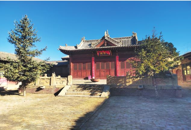 一進(jìn)院布局,中軸線現(xiàn)存有正殿1棟,兩側(cè)建有配殿,西北角建有偏殿。正殿磚砌臺基,面寬五間,進(jìn)深六椽,七檁前后廊式構(gòu)架,前檐斗拱為五踩,后檐為三踩斗拱,單檐懸山頂。前設(shè)月臺,建有抱廈三間,單檐歇山頂?,F(xiàn)新塑像3尊,正殿梁架有彩繪。