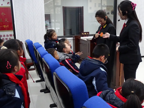 在審判法庭,法院干警深入淺出地向?qū)W生們介紹了法庭的分設(shè)區(qū)域、庭審流程、訴訟參與人、法槌起源和具體的使用方法。通過互換角色的“沉浸式”體驗,法律不僅僅是教科書中枯燥無味的文字,法庭的莊重與法律的嚴謹已化作一幅幅生動的畫面,深深烙印在他們的記憶中。